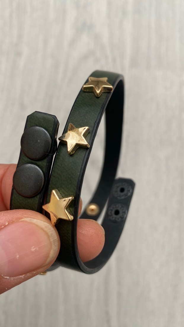 Koyu kamuflaj desenli, altın yıldızlı ve tokalı rock punk tarzı bileklik. Günlük kullanım için uygun.