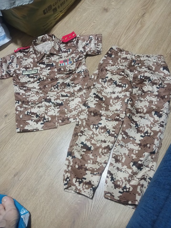 Açık kahverengi kamuflaj desenli çocuk takımı, kısa kollu ve yaka tipi kesik yaka. Kemerli ve rahat kesim, trend sokak giyimi için uygundur.
