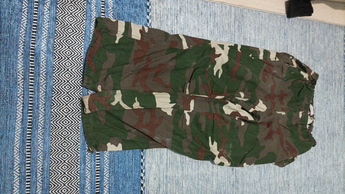 Koyu çok renkli kamuflaj desenine sahip bir paraşüt pantolon üstünde küçük lekeler var 'sprey boya lekesi'