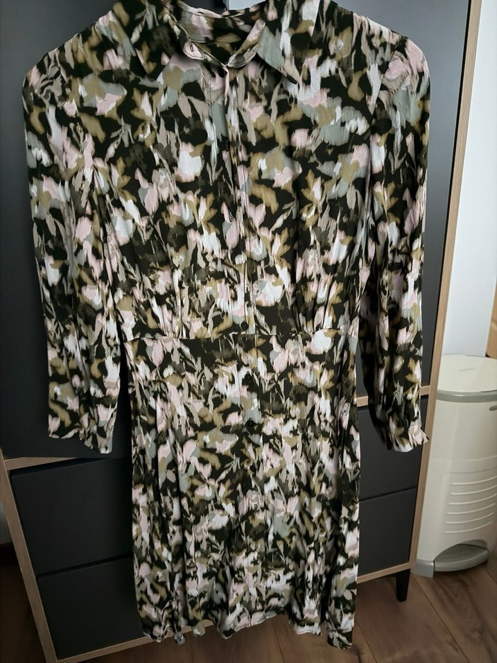 Gri ve khaki kamuflaj desenli, yüksek yakalı, düğmeli, uzun kollu, normal uzunlukta bol kesim elbise . Sentetik kumaştan yapılmıştır, günlük sokak stili için uygundur.