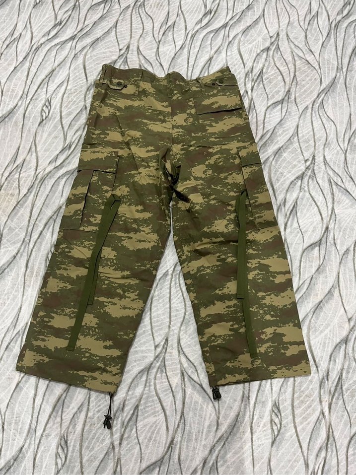 Sentetik kumaştan, koyu haki kamuflaj desenli, kemerli, bol kesim ve midi boy erkek pantolon. Sokak tarzı ve açık hava kullanımı için uygundur.
