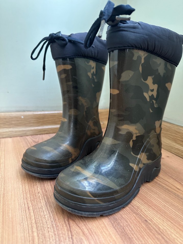 kamuflaj desenli, lastik erkek çocuk çizme. Üst kısmı bağcıklı ve tokalı, sokak stili için uygun.