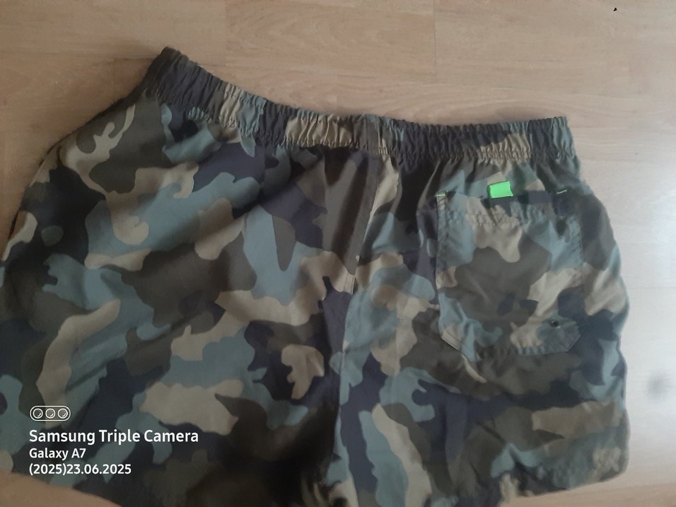 Yeşil ve gri kamuflaj desenli erkek çocuk şortu, lastikli bel ve arkada cep özelliğine sahip. Hafif ve çabuk kuruyan kumaştan yapılmıştır.