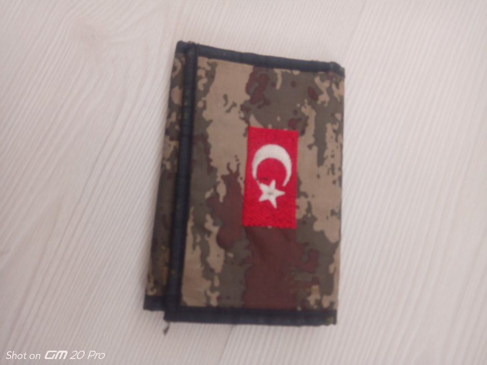 Koyu kahverengi kamuflaj desenli, sade tarzda erkek cüzdanı. Üzerinde Türk bayrağı işleme bulunur, grunge punk stiline uygundur.