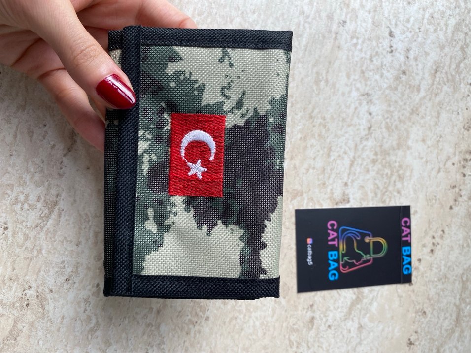 Koyu gri kamuflaj desenli, önünde Türk Bayraklı erkek cüzdan