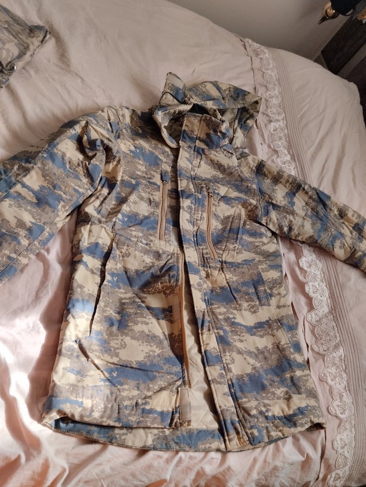 Gri ve kahverengi tonlarda kamuflaj desenli, bol kesim erkek mont. Uzun kollu, yakalı ve düğmeli, outdoor sokak stili için uygun.