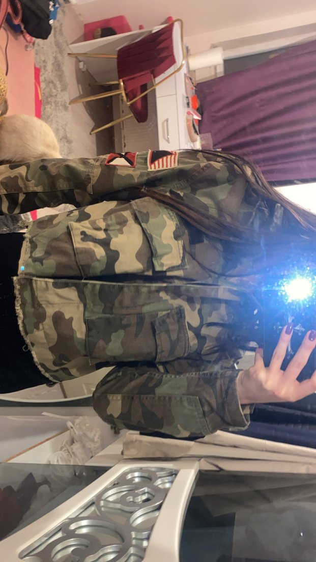 kamuflaj desenli, kemerli ve cep detaylı kadın ceket. Straplez yakalı, askılı kollu ve midi boyda, grunge punk tarzında, dış mekan kullanımı için uygun.sorunu yok