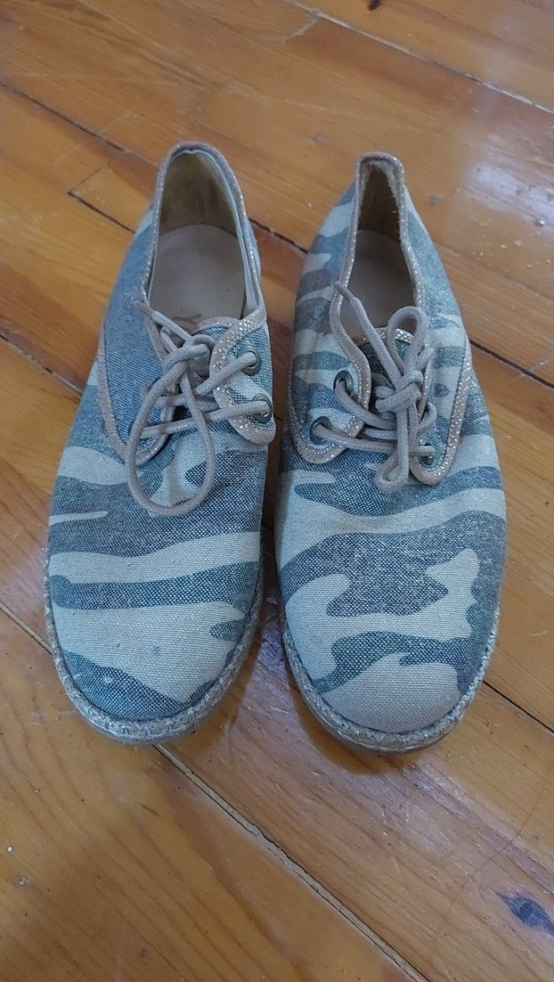 Mavi kot kumaştan, gri kamuflaj desenli kadin espadril. Bağcıklı, rahat ve şık, günlük kullanıma uygun.