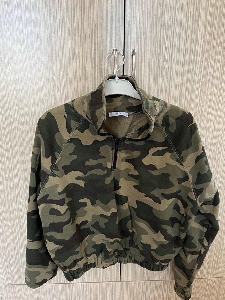 Kamuflaj desenli, boğazlı ve uzun kollu kadın ceket. Bol kesim, mini boy ve fermuarlı. Sentetik kumaştan, haki ve gri tonlarında, dış mekan için uygun.
