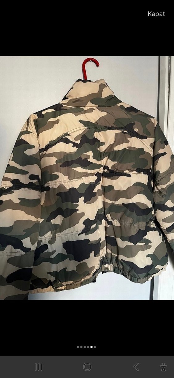 Kahverengi kamuflaj desenli, düğmeli, boğazlı ve uzun kollu kadın montudur. Sentetik kumaştan, midi boyda ve bol kesimdir. Sokak stiline uygundur.