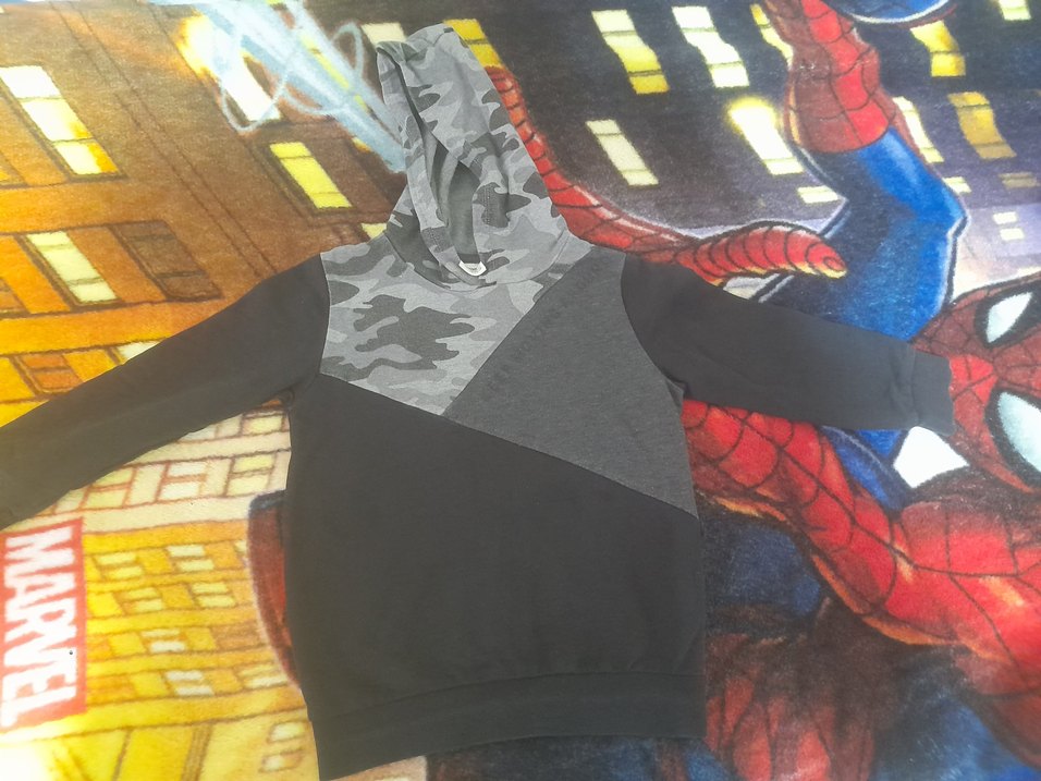 Bu kamuflaj desenli kapüşonlu erkek sweatshirtü, yumuşak ve sıcak kumaştan üretilmiş, fermuarlı ve uzun kolludur. Gri tonlarında, dar kesim ve sokak tarzındadır.