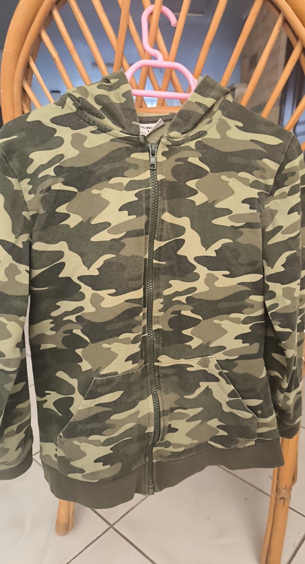 Kamuflaj desenli, kapüşonlu ve fermuarlı erkek çocuk ceketi. Bir kolunda küçük bir defo var fotoğraflandı başka kusuru yok.
