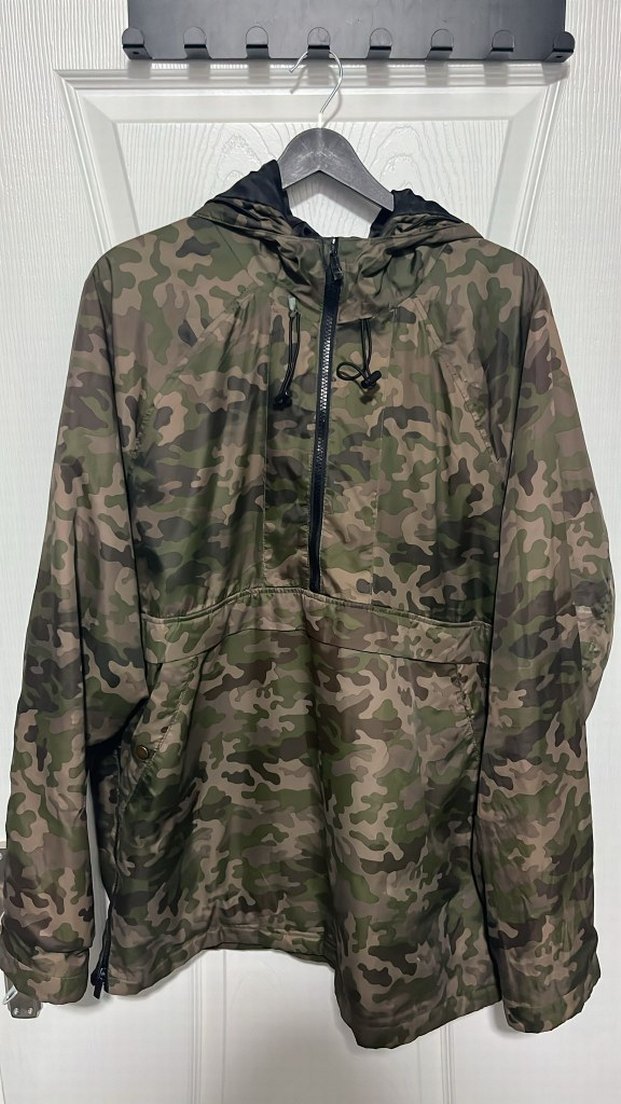 Erkekler için kamuflaj desenli, kapüşonlu ve fermuarlı, bol kesim yağmurluk. Uzun kollu, normal midi boyda, dış mekan kullanımı için sentetik kumaştan.