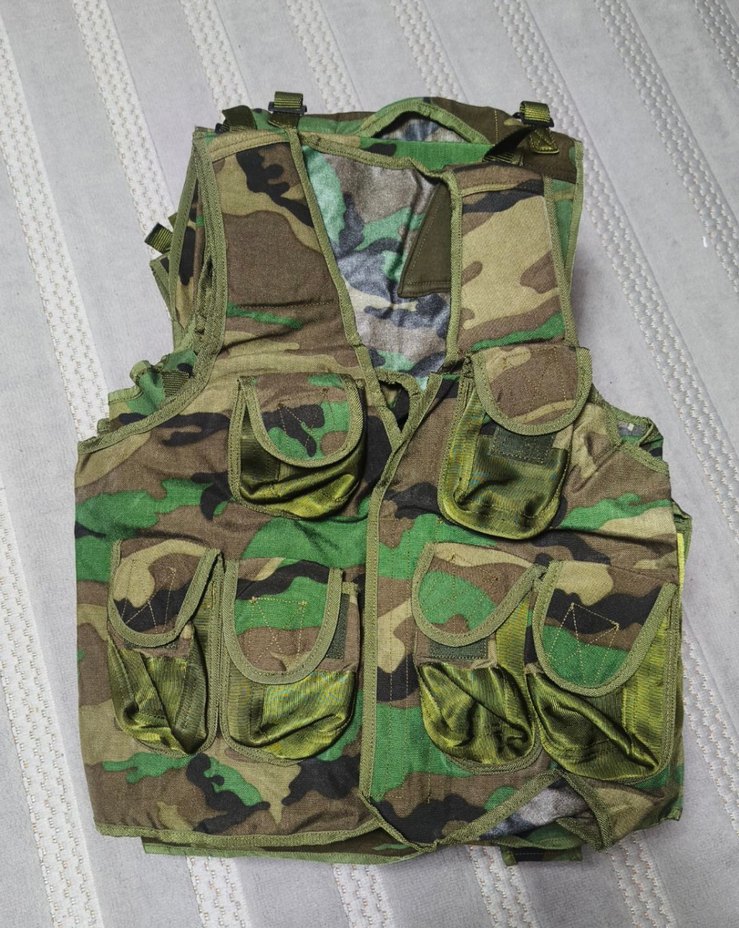 Koyu haki kamuflaj desenli, çok cepli ve kemerli, kolsuz erkek yeleği. Grunge punk tarzında, dış mekanlar için uygun.