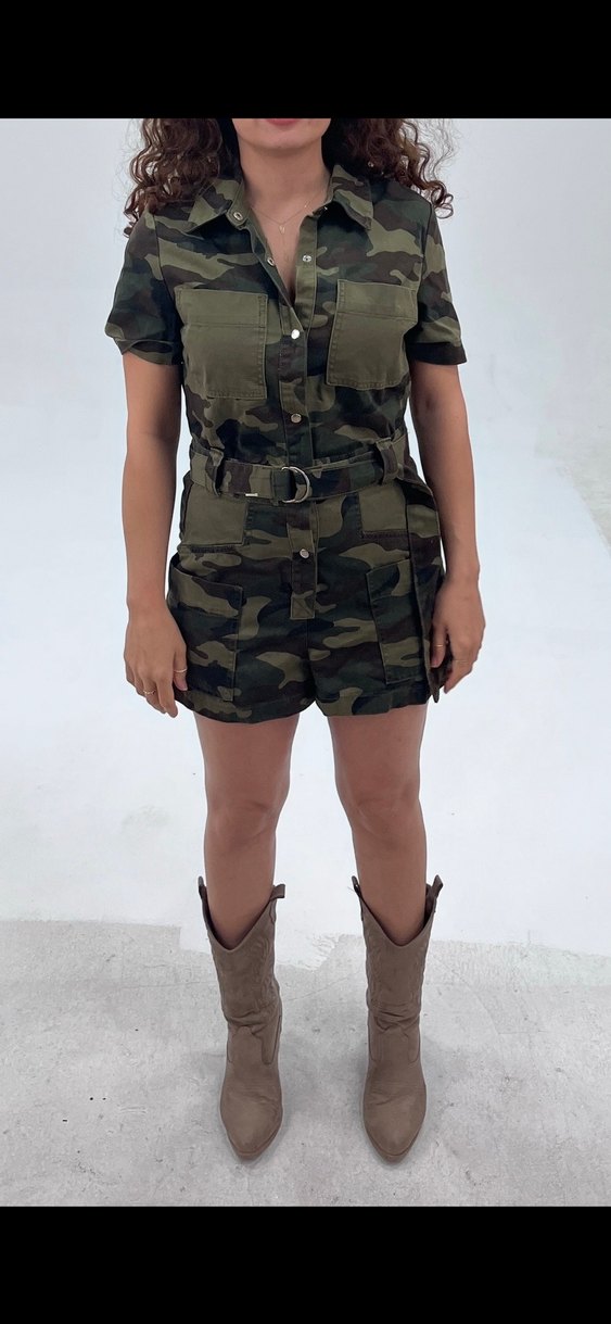 Kamuflaj Desenli Kemerli Kadın Tulum