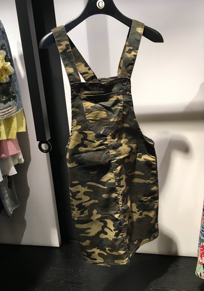 Fitted, askısız, kamuflaj desenli kısa kadın salopet. Sentetik kumaştan, tokalı askıları ve koyu haki rengiyle sokak stiline uygun outdoor kullanıma uygundur.
