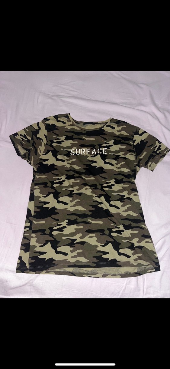 kamuflaj desenli tişört, kısa kollu ve bisiklet yaka.