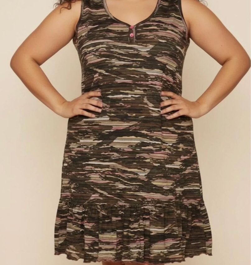 Kahverengi kamuflaj desenli, V yakalı, kolsuz midi elbise. Rahat ve bol kesim, pileli etek ucu ile günlük kullanıma uygun.