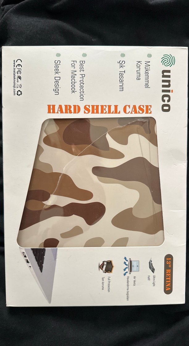 Kamuflaj desenli, camel ve gri tonlarda sert kılıf. Macbook 13 Retina için şık tasarım ve mükemmel koruma sağlar Resimde görüldüğü ufak çizdiği var hiç kullanılmadı açarken çizildi