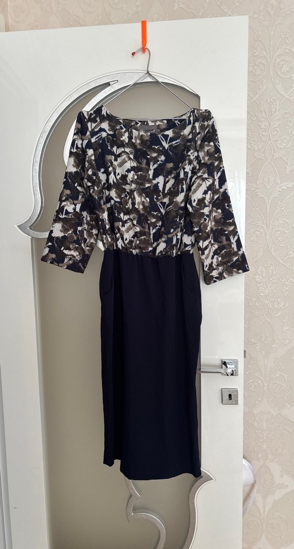 Uzun,elbise, üstte karanlık kamuflaj desenli , alt kısmı lacivert düz. Ges kollu ve kayık yaka, yumuşak sentetik kumaştan, günlük kullanım için uygun.