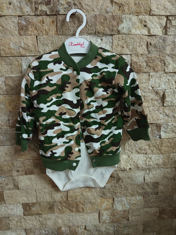 ikil takım,Kamuflaj desenli, uzun kollu ve düğmeli bu bebek body, yumuşak ve sıcak kumaştan üretilmiştir. Açık kahverengi ve yeşil tonlarında, sokak stili görünüm sunar.