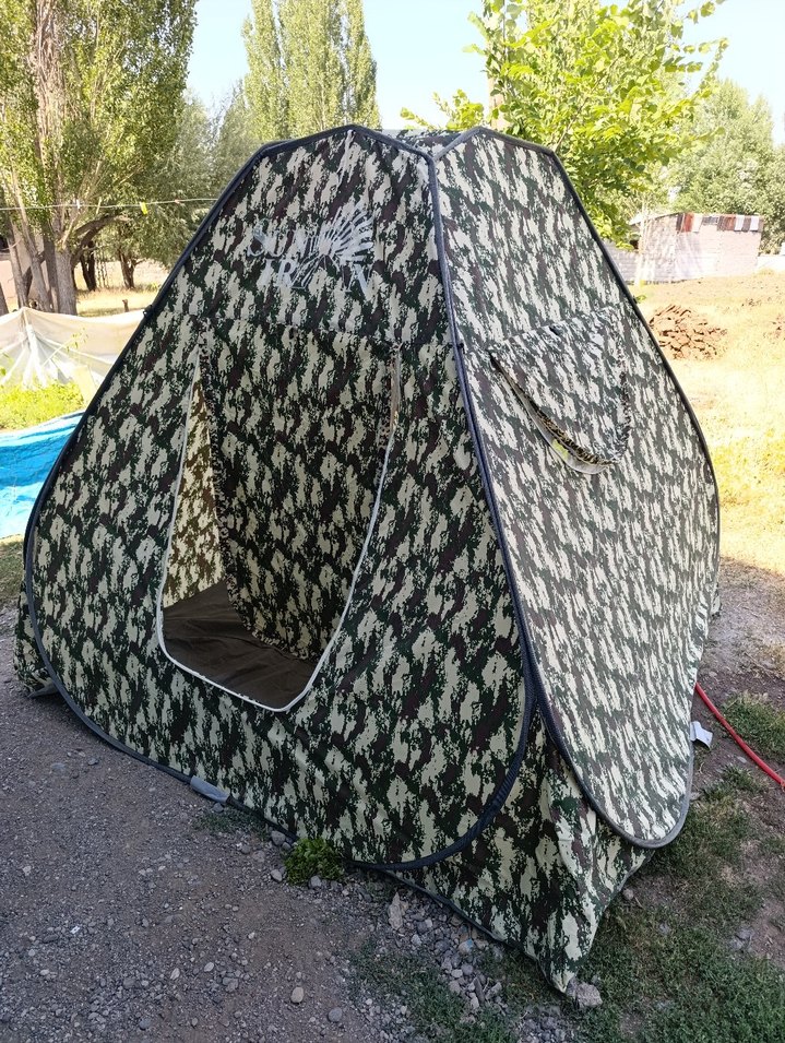 Koyu desenli yeşil kamuflaj çadır, geniş iç hacim ve ön açıklık içerir. Açık hava kullanımı için uygundur. ️