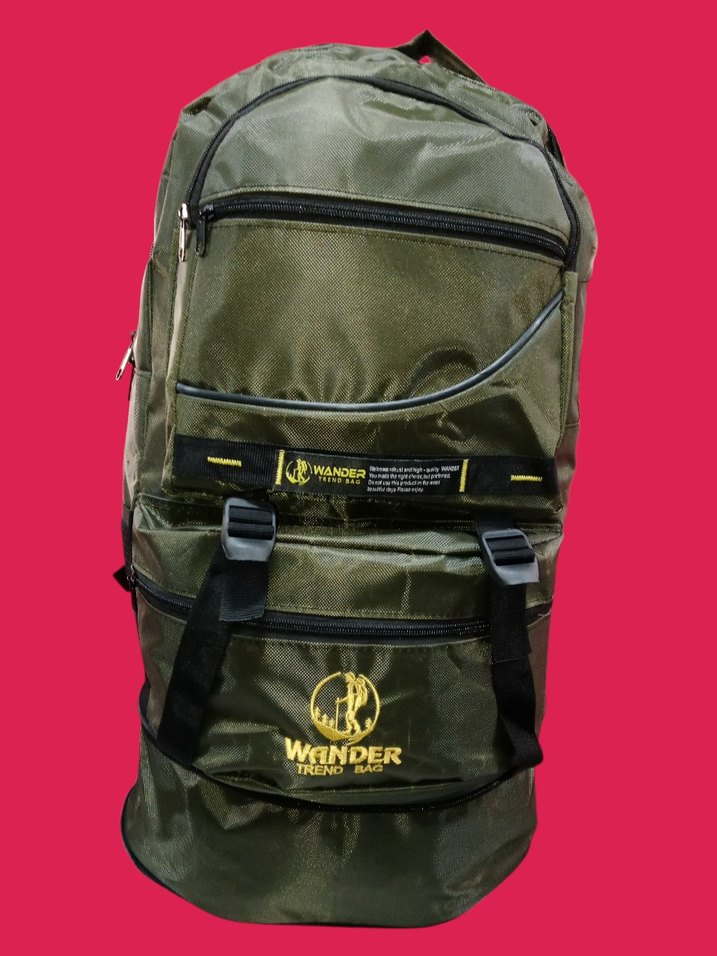 Parlak yeşil renkte, kamuflaj desenli ve çoklu fermuarlı bölmeleri bulunan sırt çantası. Trend sokak stili ve ön kısmında "WONDER" yazısı var.