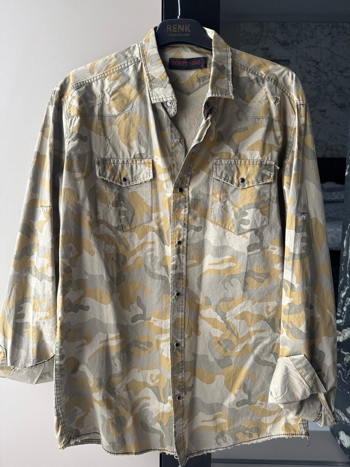 Askeri desen kamuflaj desenli, düğmeli, uzun kollu, yakalı ve bol kesim. Yumuşak dokulu kumaştan üretilmiş, günlük kullanıma uygun. Xl yazıyor ama ben s bedenken giydim m bedenlilere de olur.