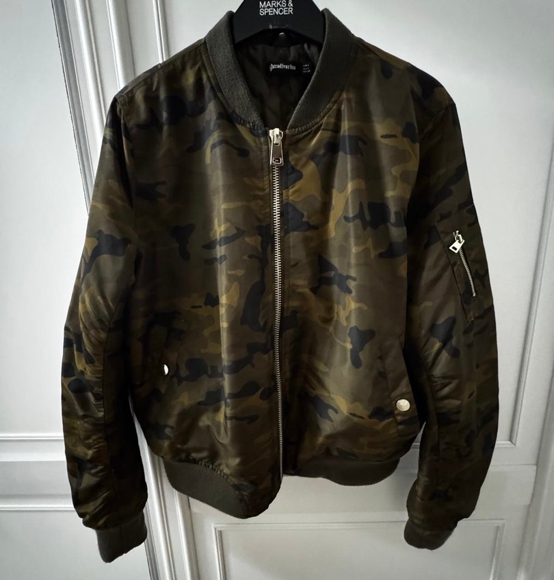 Düğmeli, kahverengi kamuflaj desenli kadın ceket. Normal boy, bol kesim ve uzun kollu, sentetik kumaştan üretilmiştir. Notlu yaka ve fermuarlı kapama içerir.