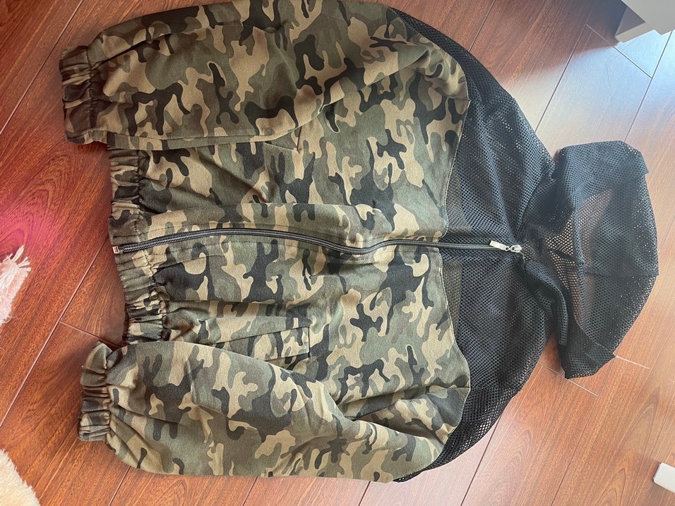 kamuflaj desenli, kapüşonlu ve fermuarlı, skumaştan yapılmış rahat kesim bir ceket.