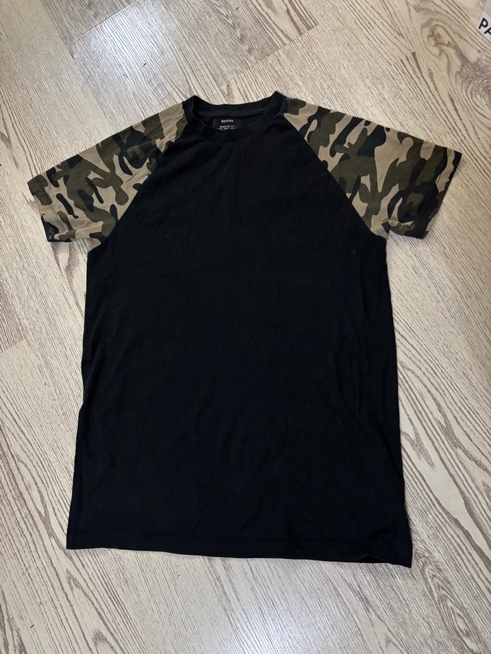 Kamuflaj desenli kısa kollu ve siyah gövdeli, yuvarlak yaka erkek tişörtü. Sentetik kumaştan, bol kesim ve günlük kullanım için uygun. Bershka