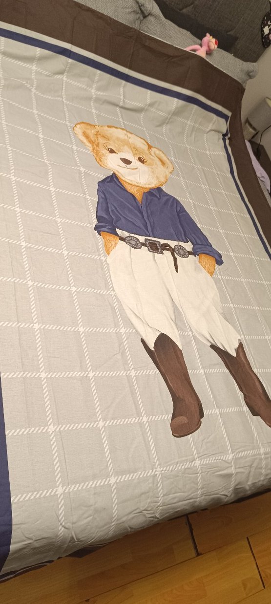 Madame Coco tek kişilik sıfır 160&200 ölçüde.Gri kare desenli zeminde, mavi gömlekli ve kahverengi çizme giymiş kamel renkli ayıcık figürlü çocuk halısı. sadece nevresim