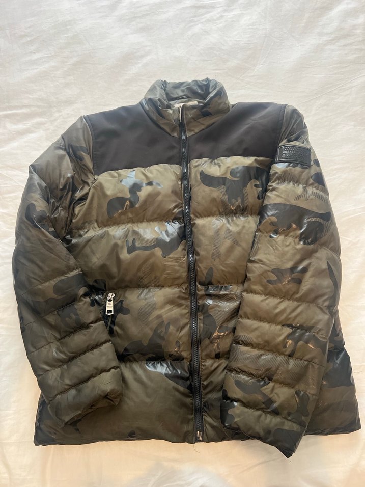Haki yeşil kamuflaj desenli, sentetik kumaştan yapılmış, fermuarlı, normal uzunlukta, dar kesim erkek mont. Sokak stili için uygun.