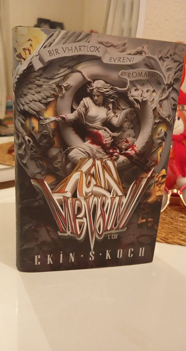 Ekin S. Koch'un 'kan mevsimi Romanı' adlı romanı, kanlı ve fantastik figürlerin yer aldığı bir kapakla sunuluyor. ayraç ve posteri vardır.