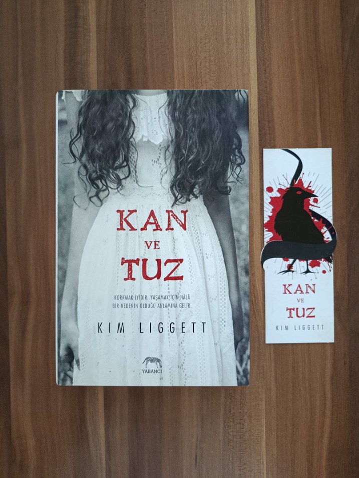 Kim Liggett'in Kan ve Tuz adlı romanı, beyaz elbiseli bir kızın yer aldığı etkileyici kapağa sahip. Karanlık temalar ve gerilim içerir. Ayracıyla birlikte. Güneşten kaynaklı sayfa kenarlarında sarılıklar mevcuttur.