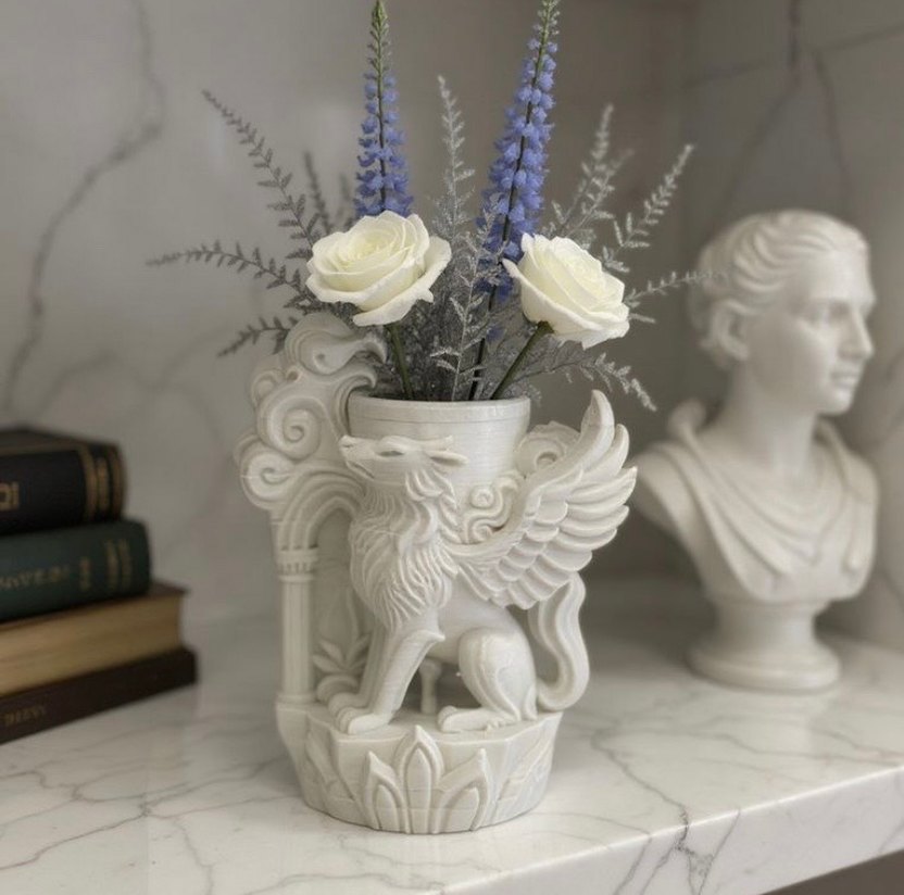 Kanatlı aslan figürlü beyaz vazo detaylı işçiliğiyle dikkat çeken bir dekoratif ürün. 3D yazıcıda Pla baskı ile yapılmıştır.