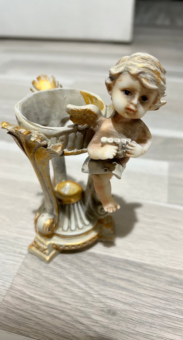 Kanatlı melek figürü, küçük bir obje tutuyor ve altın detaylı süslü gri beyaz bir kaideye bağlıdır.
