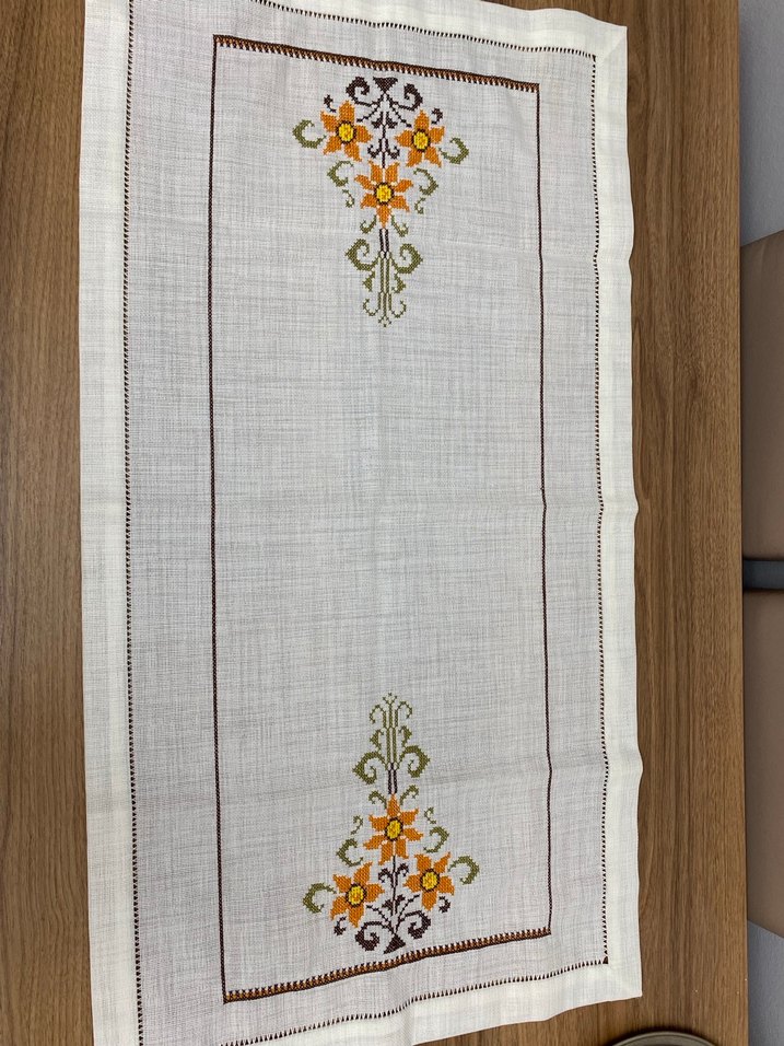her iki ucunda çiçek desenleri bulunan klasik tarzda masa örtüsü.