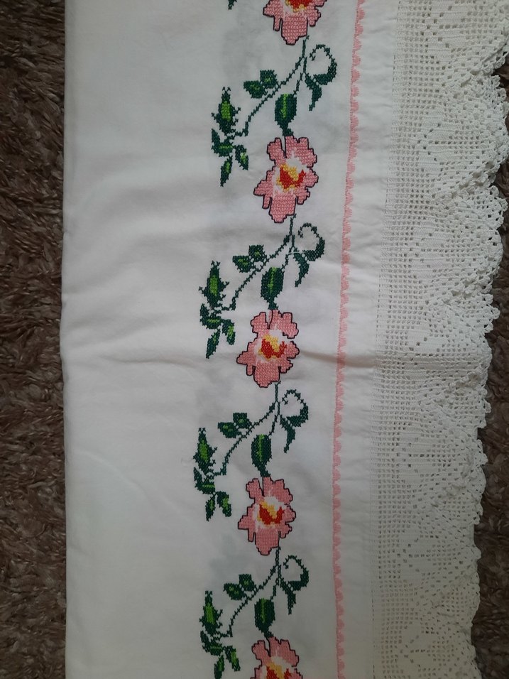 Pembe çiçekler ve yeşil yapraklarla işlenmiş beyaz örtü, ince dantel kenar süslemeli.2 etek 1 uzun yastık