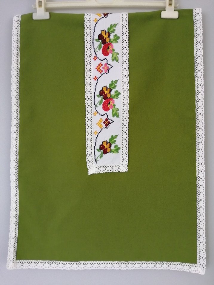 Kanaviçe işleme çiçek desenleri ve dantel süslemeli açık yeşil masa örtüsü runner. Hem kullanışlı hem dekoratif.