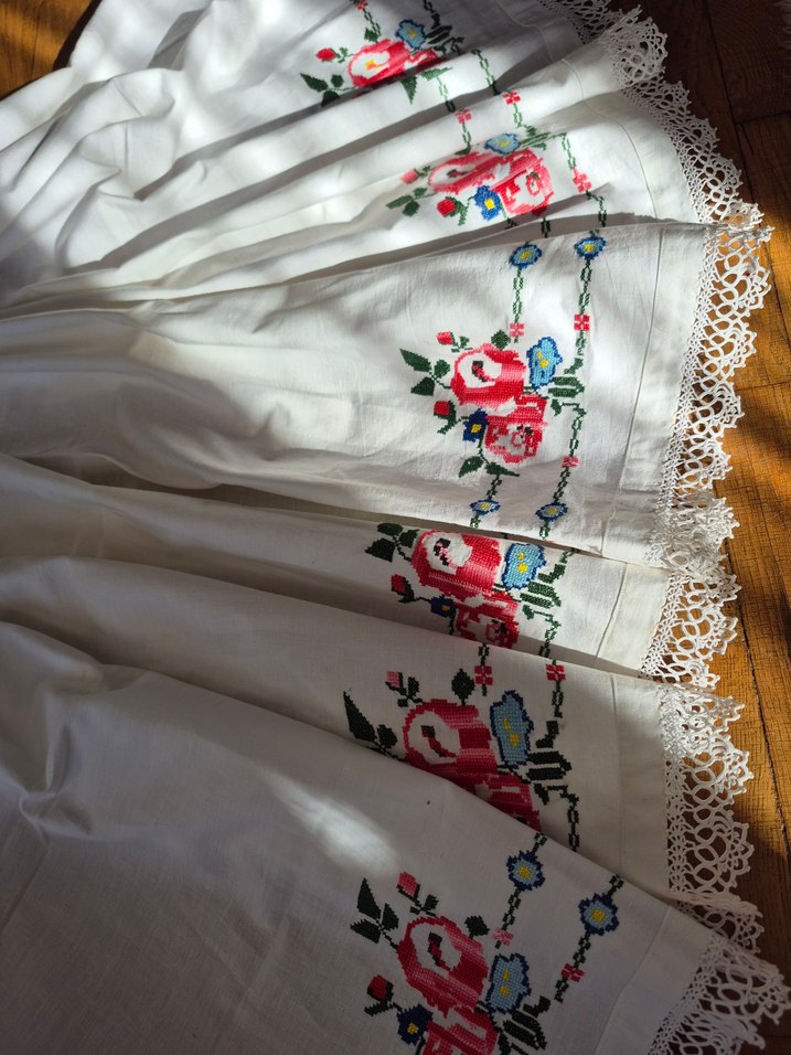 Çiçek nakışları ve ince dantel kenarları olan beyaz kumaş, geleneksel el işçiliğini yansıtır. kusursuz işçilik ve renklerde