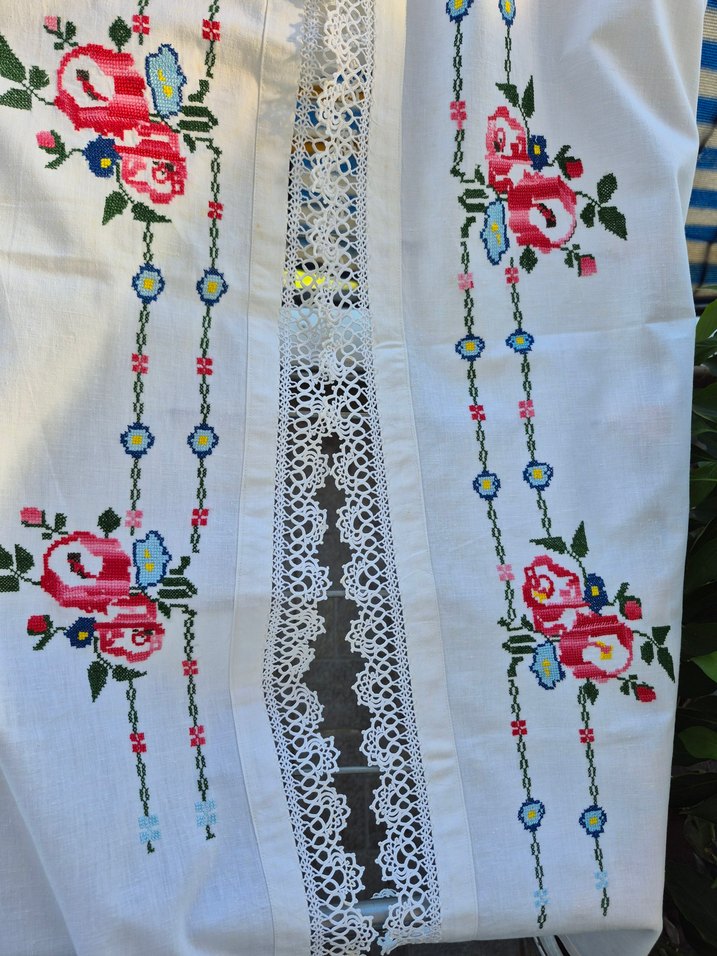 Bohem tarzı el işi, etnik çiçek işlemeleri ve dantel detaylı beyaz kumaş. sandıktan çeyizlik