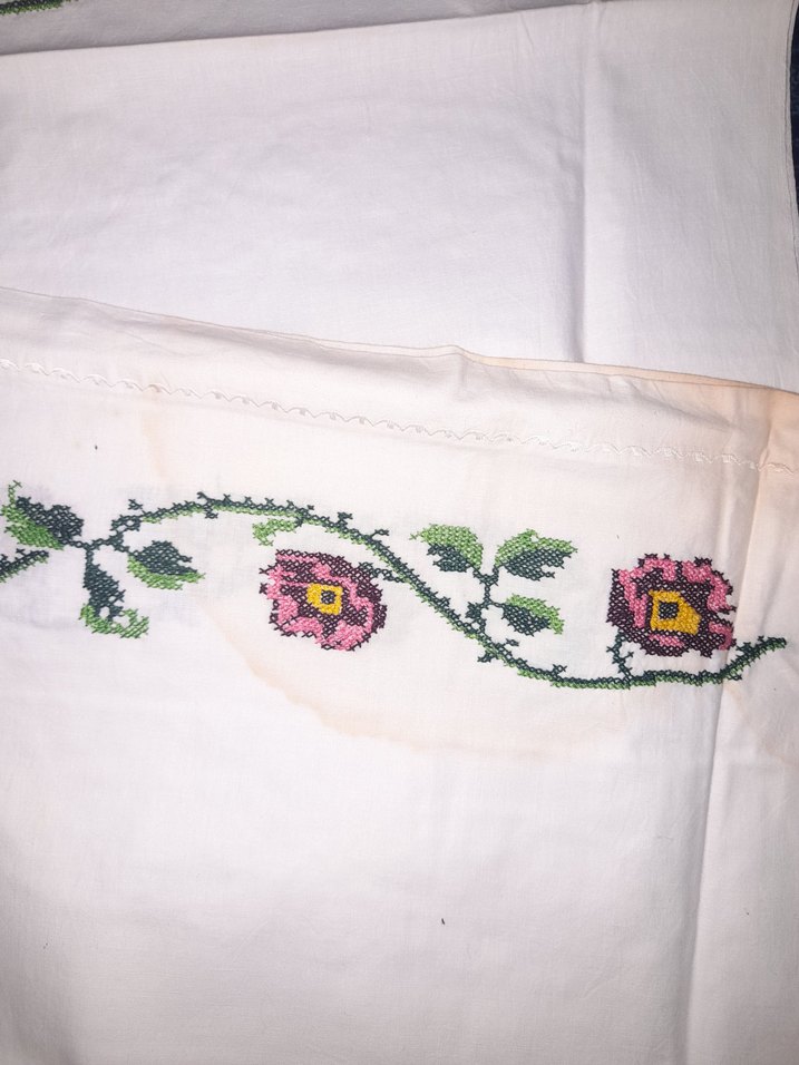 el işlemesi kanavice küstüm yastığı kenari dikişli değil çarşaf şeklinde açılınca. sandık lekesi var çarşaf kısmındaki leke büyük bir yuvarlak şekilde kanaviçe üzerinde ise daha küçük lekeler var sandık lekeleridir hiç kullanılmamış yıllardır duruyor.