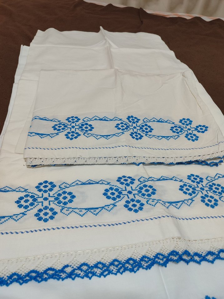 Mavi nakışlı çiçek desenleri ve dantel kenarlığı olan beyaz kanaviçe Karyola Takımı. Geleneksel tarzda, hafif ve zarif detaylara sahiptir.