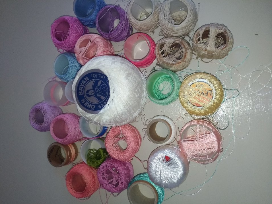 Çeşitli renklerde iplik toplarından oluşan set, el sanatları ve karşı kültür tarzları için uygundur.