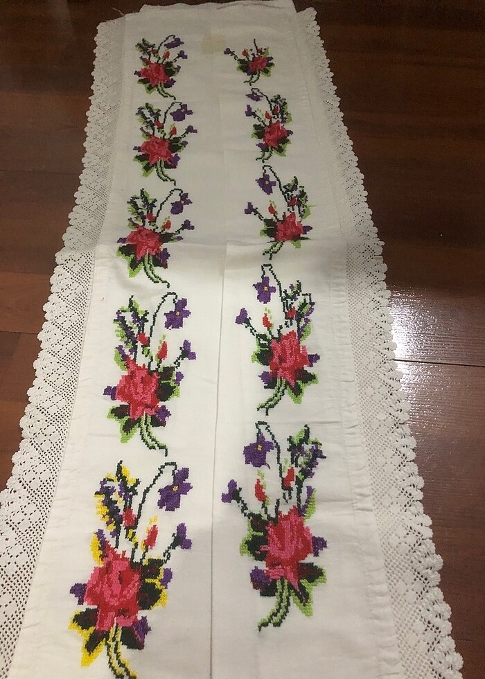 Kullanılmamış iki tarafı da tamtur işlenmiş bir yastık.İster runner yapın ister yastık olarak değerlendirin ya da nasıl ve nerede tasarruf etmek isterseniz girdiği alana şıklık ve renk katacaktır.Goblen gibi işlenmiş renkler muhteşem bir gülü nazarlık olarak düşünülüp yaprakları bir motifte sarıdır.