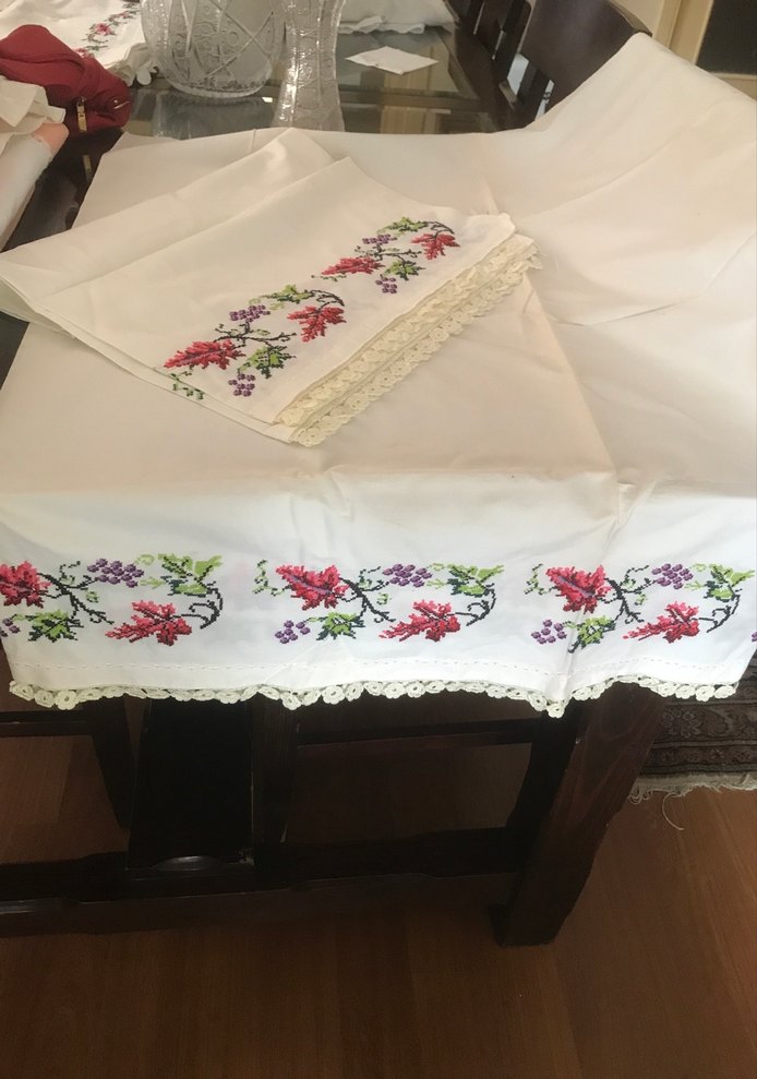 Kenarlarında nakışlı çiçek desenleri ve dantel süslemeleri bulunan beyaz masa örtüsü, geleneksel bir görünüm sunar.