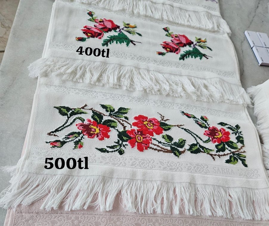 Çiçek işlemeli, püsküllü beyaz havlular. Geleneksel desenlere sahip, açık renkli ve klasik tarzda.