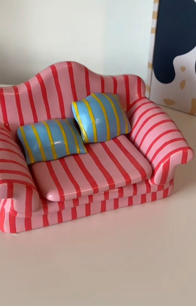 İki mavi-sarı çizgili yastıklı, pastel pembe çizgili takı kanepesi. ️seramiktir. İstenilen renk yapılır. #takılık