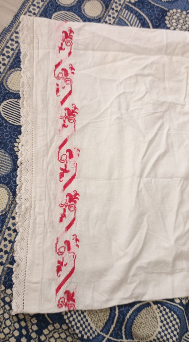 Kenarında kırmızı nakışlı desenler bulunan konvansiyonel beyaz masa örtüsü. Hafif ve sade tasarımıyla masanızı tamamlar. ️